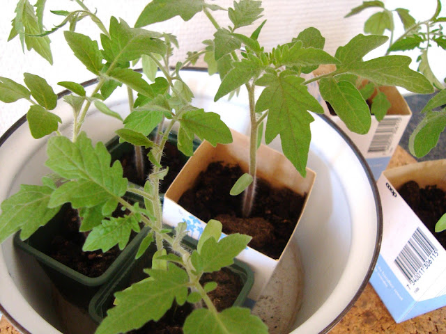 Min efterhånden store tomatplanter ryger ud i haven en af de kommende dage - potterne er alt for små til dem allerede nu. For stadig at have et eller andet grønt, røg farverige små miniatureblomster med hjem til Lotuskasserollen. Mine sidste to kasseroller har i øvrigt fået fjernet hanken, så nu har jeg endnu flere urtepotteskjulere i vindueskarmene. Det må jeg vist også lige få postet et billede af.