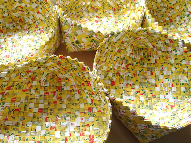 Rullen med overskydende plast fra Arla skrumper - 5 kurve og 1 pung er færdig, der mangler yderligere 5 kurve og 1 pung. Heldigvis skal jeg snart have gang i den lille rest lilla plast der medfulgte, så er der lidt andet at kigge på end ananas og hyldeblomst i metermål :-)